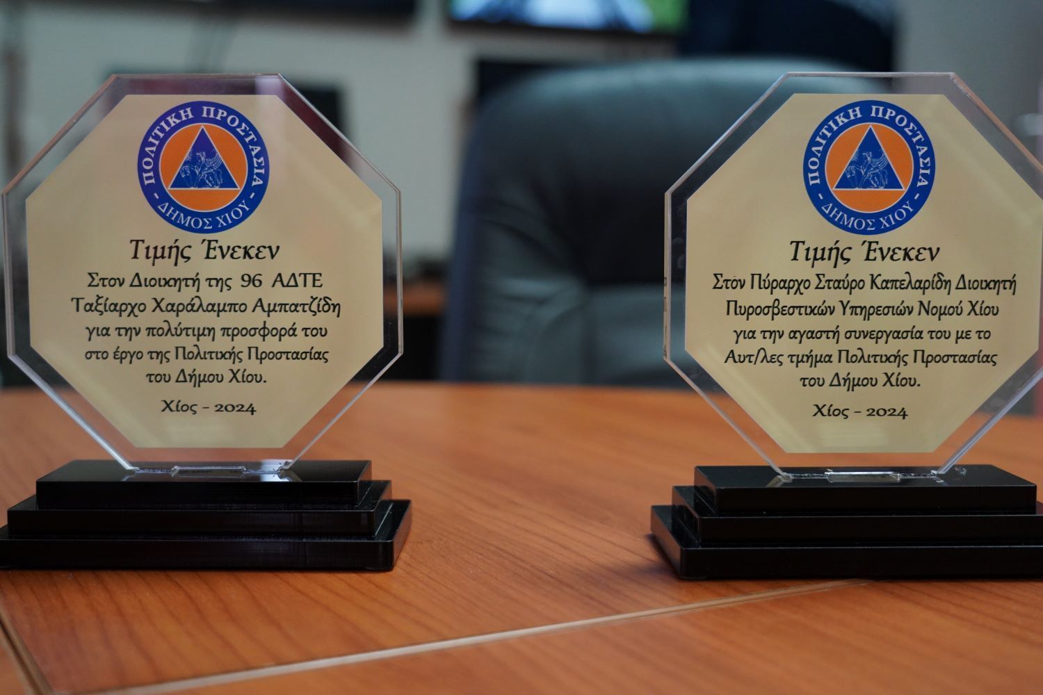 Τον Διοικητή της 96 ΑΔΤΕ Ταξίαρχο Χαράλαμπο Αμπατζίδη και τον Διοικητή της Πυροσβεστικής Υπηρεσίας Νομού Χίου Σταύρο Καπελαρίδη, βράβευσε με τιμητική πλακέτα το Αυτοτελές τμήμα Πολιτικής Προστασίας Δήμου Χίου.
