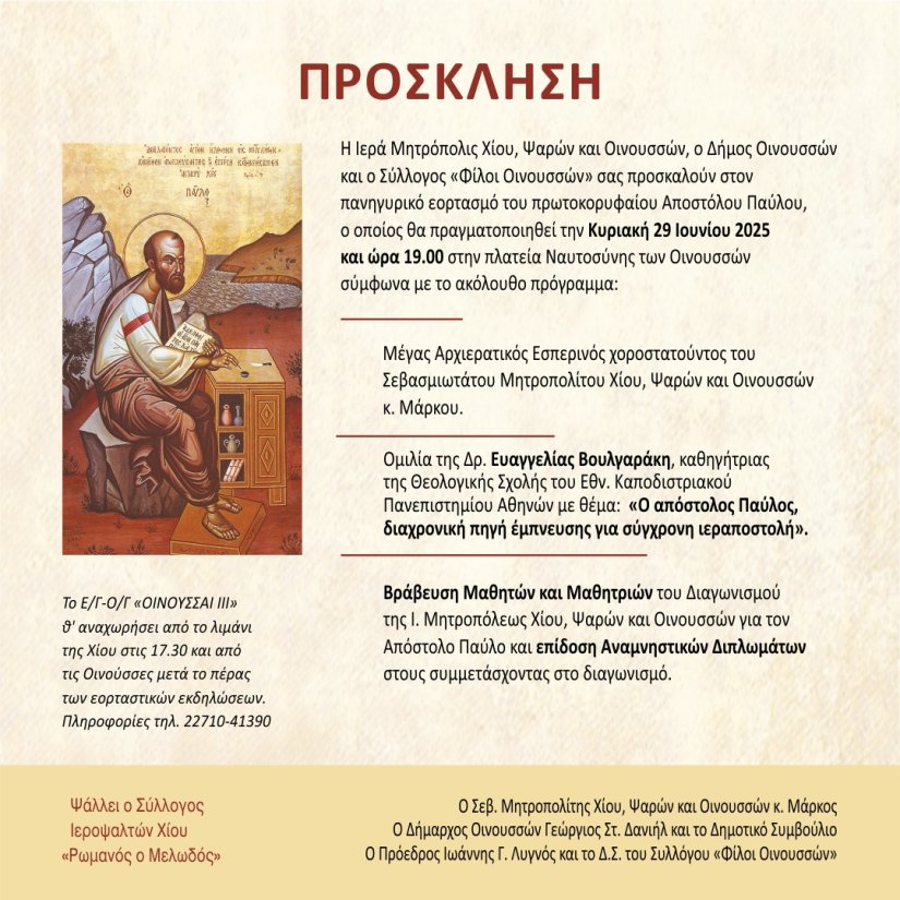 Όπως κάθε χρόνο έτσι και φέτος στις Οινούσσες πραγματοποιείται πανηγυρικός εορτασμός του πρωτοκορυφαίου Αποστόλου Παύλου, την Κυριακή 29 Ιουνίου, στις 7 μ.μ.