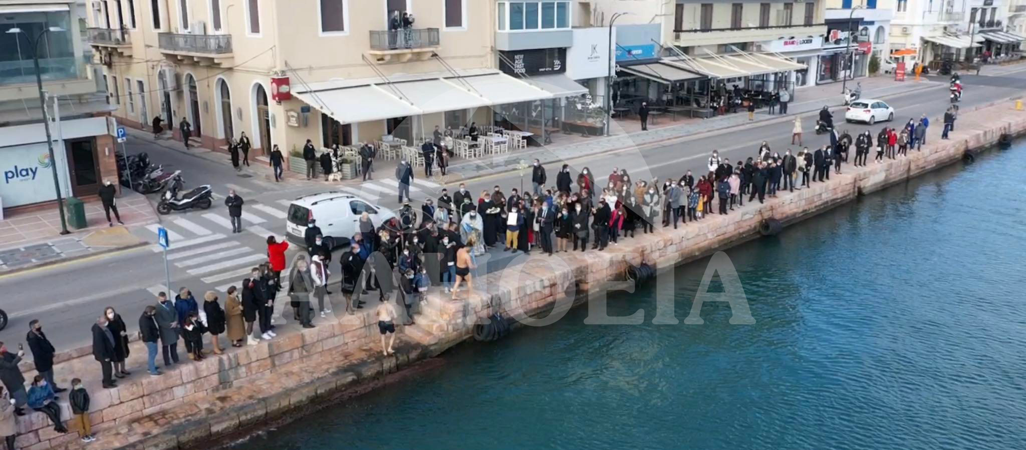 Παρουσία λίγων πιστών και του Δημάρχου Χίου Σταμάτη Κάρμαντζη τελέσθηκε το πρωί στο λιμάνι της Χίου ο αγιασμός των υδάτων από τον Αιδεσιμότατο πατέρα Ιωάννη Μουσσά.