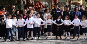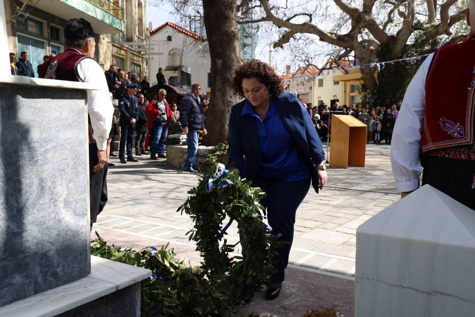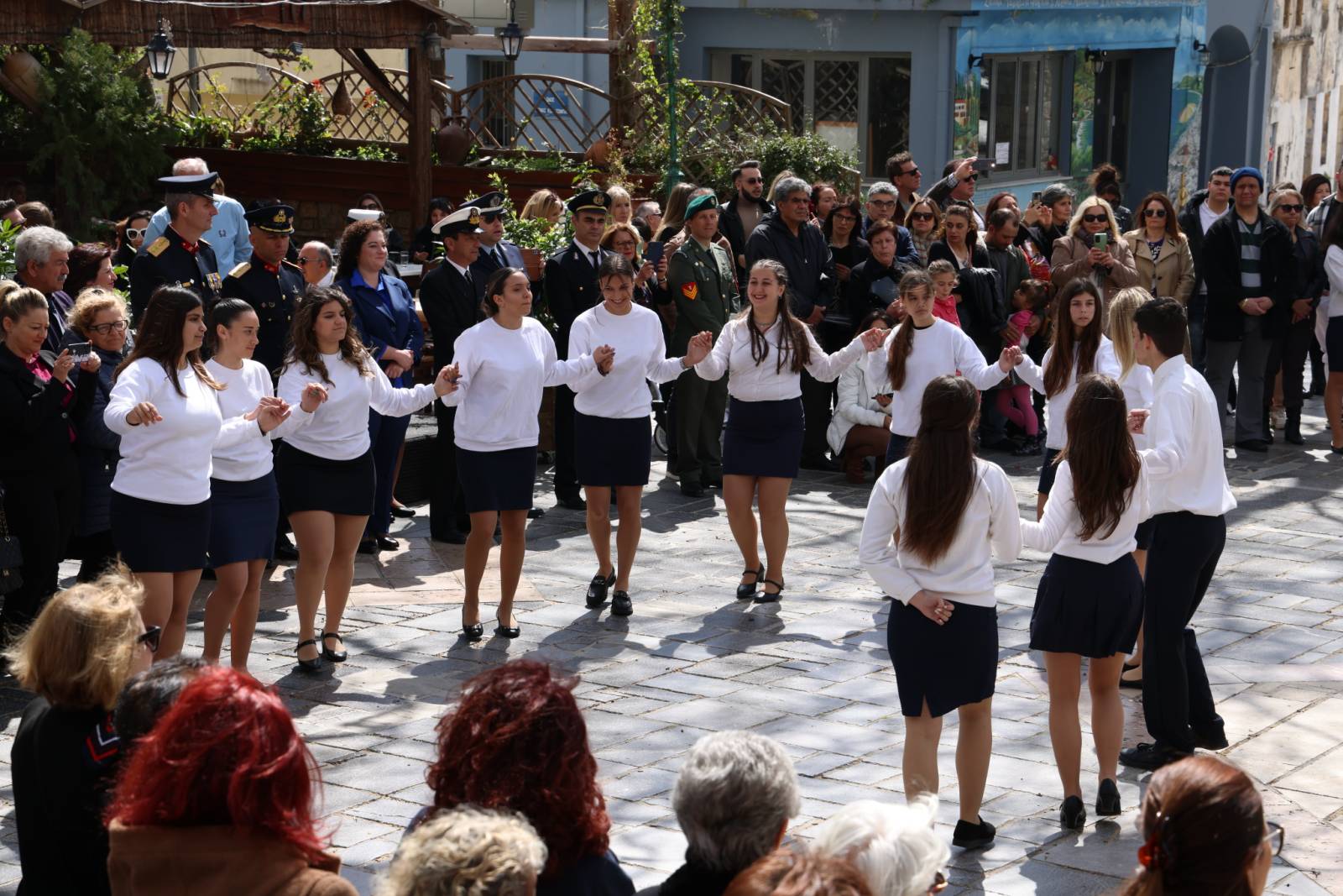 Στη συνέχεια κατευθύνθηκαν στην πλατεία του χωριού για να ακούσουν τον πανηγυρικό της ημέρας, από την διευθύντρια του Γυμνασίου Καρδαμύλων Ελένη Γεωργούλη. Ακολούθησε κατάθεση στεφάνων στο Ηρώων, ποιήματα από τους μαθητές και στη συνέχεια παραδοσιακοί χοροί.