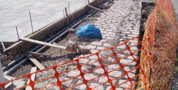 Το έργο, είχε καθυστερήσει λόγω των παραδοσιακών παβέδων που βρέθηκαν στο σημείο. Όπως ανέφερε ο κ. Ζωάνος οι παβέδες θα παραμείνουν σε δυο σημεία, δεξιά και αριστερά στην ράμπα, ενώ στο μοναδικό σημείο που θα σκεπαστούν θα είναι στην εισοδο της πόρτας αναχώρησης των επιβατών.