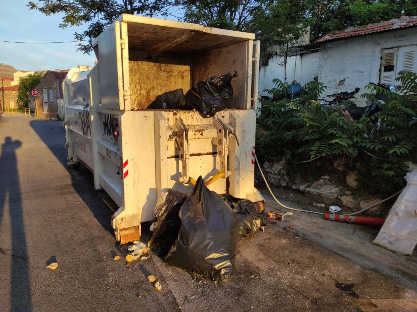 Η εικόνα του Κιβωτίου συμπίεσης απορριμμάτων του Δήμου Χίου, πίσω από το ΡΕΞ, το πρωϊ της Τετάρτης.