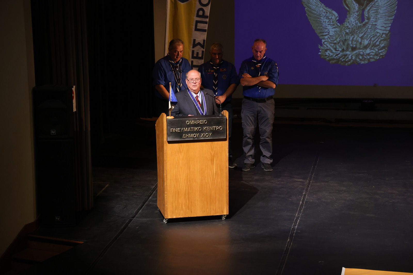 Ακολούθησε η απονομή του μεταλλίου προσκοπικής αξίας στη σημαία της Περιφερειακής Εφορίας Προσκόπων Χίου από τον Γενικό Γραμματέα του Διοικητικού Συμβουλίου του Σώματος Ελλήνων Προσκόπων, Ξενοφώντα Σπιταδάκη, η απονομή του παρασήμου του Αργυρού Φοίνικα στον Βίκτωρα Μπουμπάρη για τις πολύτιμες υπηρεσίες του στο χιακό προσκοπισμό, από τον Γενικό Έφορο του Σ.Ε.Π. Σταύρο Δημητρόπουλο και έπαινοι στα 5 λειτουργούντα σήμερα Συστήματα.