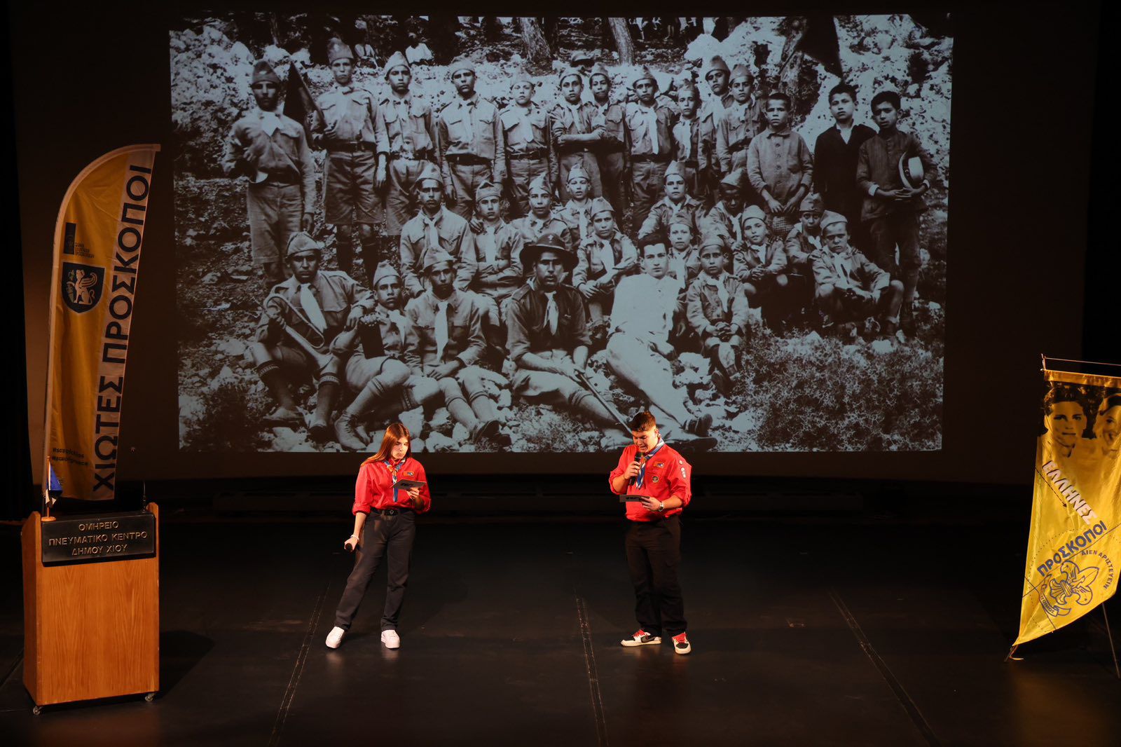 Στη διάρκεια της εκδήλωσης έγινε μια φιλότιμη προσπάθεια να χωρέσει σε λίγο χρόνο μία αναδρομή στην πλούσια ιστορία του χιακού προσκοπισμού από το 1913, που ιδρύθηκε από τον Νικόλαο Πασπάτη, έφεδρο Ανθυπολπόιαρχο του Πολεμικού Ναυτικού, μέχρι τις μέρες μας, με οπτικοακουστικές αναφορές στα σημεία-σταθμούς και στις κυριότερες δράσεις που συμμετείχαν οι χιώτες πρόσκοποι όλα αυτά τα 110 χρόνια.