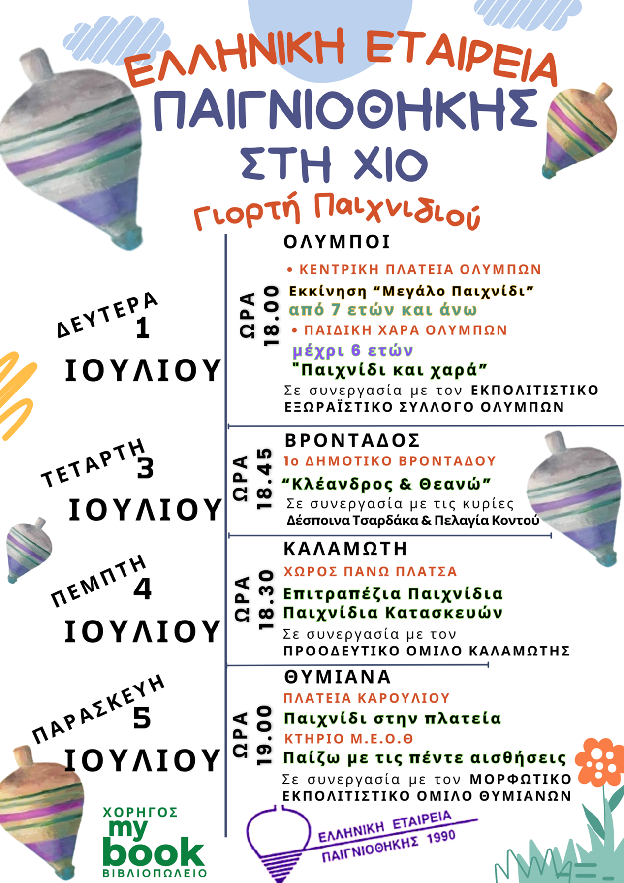 Η Ελληνική Εταιρεία Παιγνιοθήκης έρχεται στη Χίο και διοργανώνει γιορτή παιχνιδιού από τη Δευτέρα 1 Ιουλίου έως την Παρασκευή 5 Ιουλίου σε Ολύμπους, Βροντάδο, Καλαμωτή και Θυμιανά.