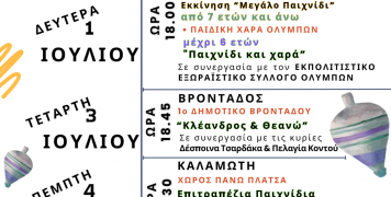 Στους Ολύμπους την 1/7 στις 6 μ.μ. τα παιχνίδια θα λάβουν χώρα στην κεντρική πλατεία του χωριού και στην παιδική χαρά, την Τετάρτη 3 Ιουλίου στις 6.45 μ.μ. ακολουθούν δράσεις στο 1ο δημοτικό σχολείο Βροντάδου, την Πέμπτη 4 Ιουλίου στις 6.30 μ.μ. στην Πάνω Πλάτσα Καλαμωτής και τέλος την Παρασκευή 5 Ιουλίου στις 7μ.μ. στην πλατεία Καρουλιού των Θυμιανών και στο κτήριο του ΜΕΟΘ.