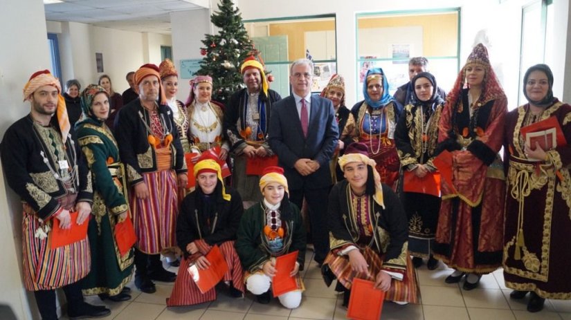 Ειδικότερα το πολιτιστικό σωματείο του νησιού μας με παραδοσιακές στολές έψαλε τα κάλαντα της Καππαδοκίας ενώ δώρισε στον κ. Μπουγδάνο ένα βιβλίο με την ιστορία της Σμύρνης και ένα γούρι για «καλή χρονιά».