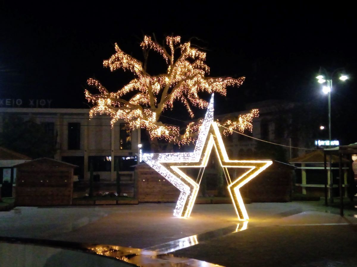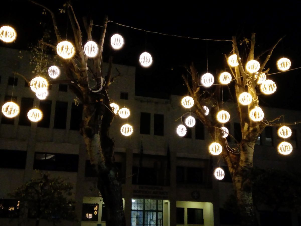 Σε σωστό χρόνο όπως επιβάλλει το έθιμο, μετά την εορτή του Αγίου Νικολάου, ξεδιπλώνεται ο εορταστικός διάκοσμος της πόλης με επίκεντρο την πλατεία, η οποία πάντως παραμένει με ανενεργό το συντριβάνι.