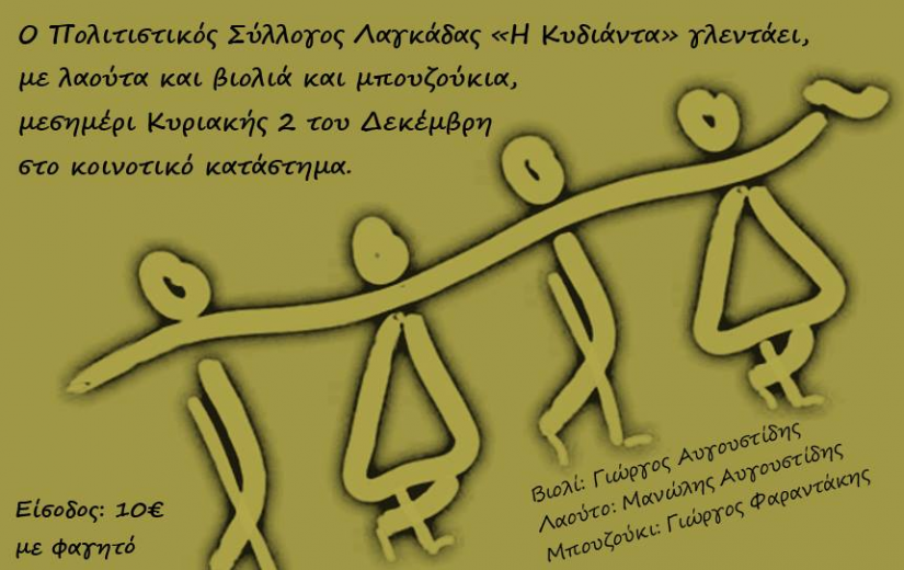 ΚοινωνίαΤετ, 28/11/2018 - 11:55 Ο Πολιτιστικός Σύλλογος Λαγκάδας "Η Κυδιάντα" γλεντάει, με λαούτα, βιολιά και μπουζούκια, την Κυριακή 2 Δεκεμβρίου, στις 2.00 το μεσημέρι, στο Κοινοτικό Κατάστημα.