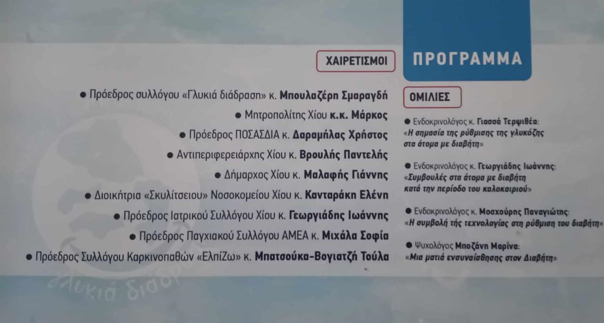 Ο νεοσύστατος Σύλλογος Ατόμων με Διαβήτη Βορείου Αιγαίου με την επωνυμία «Γλυκιά Διάδραση», πραγματοποιεί εκδήλωση-τσάι την Δευτέρα 12 Αυγούστου, στις 7μ.μ. στο ξενοδοχείο Ελληνικό Κάστρο, με σκοπό τη γνωριμία του χιακού κοινού με τις δράσεις του Συλλόγου αλλά και με τον Διαβήτη. Στην εκδήλωση θα χαιρετίσουν οι αρχές του τόπου και αλλά σωματεία, ενώ θα μιλήσουν ενδοκρινολόγοι και ψυχολόγοι του νησιού.