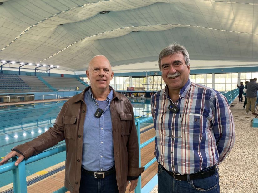 Περιηγούνται μαζί τους χώρους του νέου Ιωνικού Κολυμβητήριου, όπου ο Γιώργος Νικοκάκουρας δίνει ενδιαφέρουσες λεπτομέρειες για τις εργασίες που έγιναν εκεί και ειδικά για την νέα μεμβράνη του Κολυμβητηρίου.