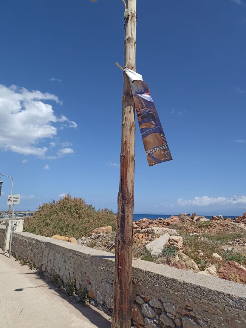 «Σανίδια από πανό για την ίδια εκδήλωση (το υπόλοιπο το πήρε ο αέρας) καρφωμένα στους «διαφημιστικούς» φοίνικες μπροστά από το ξενοδοχείο «Χανδρής»!