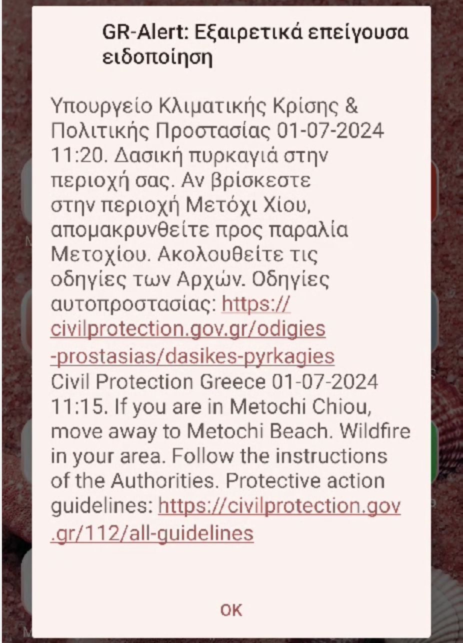 Στις 11:20 στάλθηκε μήνυμα από το 112 για να απομακρυνθούν οι κάτοικοι από την περιοχή Μετόχι και να κατευθυνθούν στην παραλία του Μετοχιού.