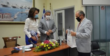 Από την πλευρά του ο Σταμάτης Κάρμανζτης δώρισε στην κ. Αγγελοπούλου το σύμβολο της Χίου, ένα μετάλλιο με τη Σφίγγα ενώ μια χιακή έκδοση με αφιέρωση έδωσε ο Πρόεδρος του Δ.Σ. Παύλος Καλογεράκης.