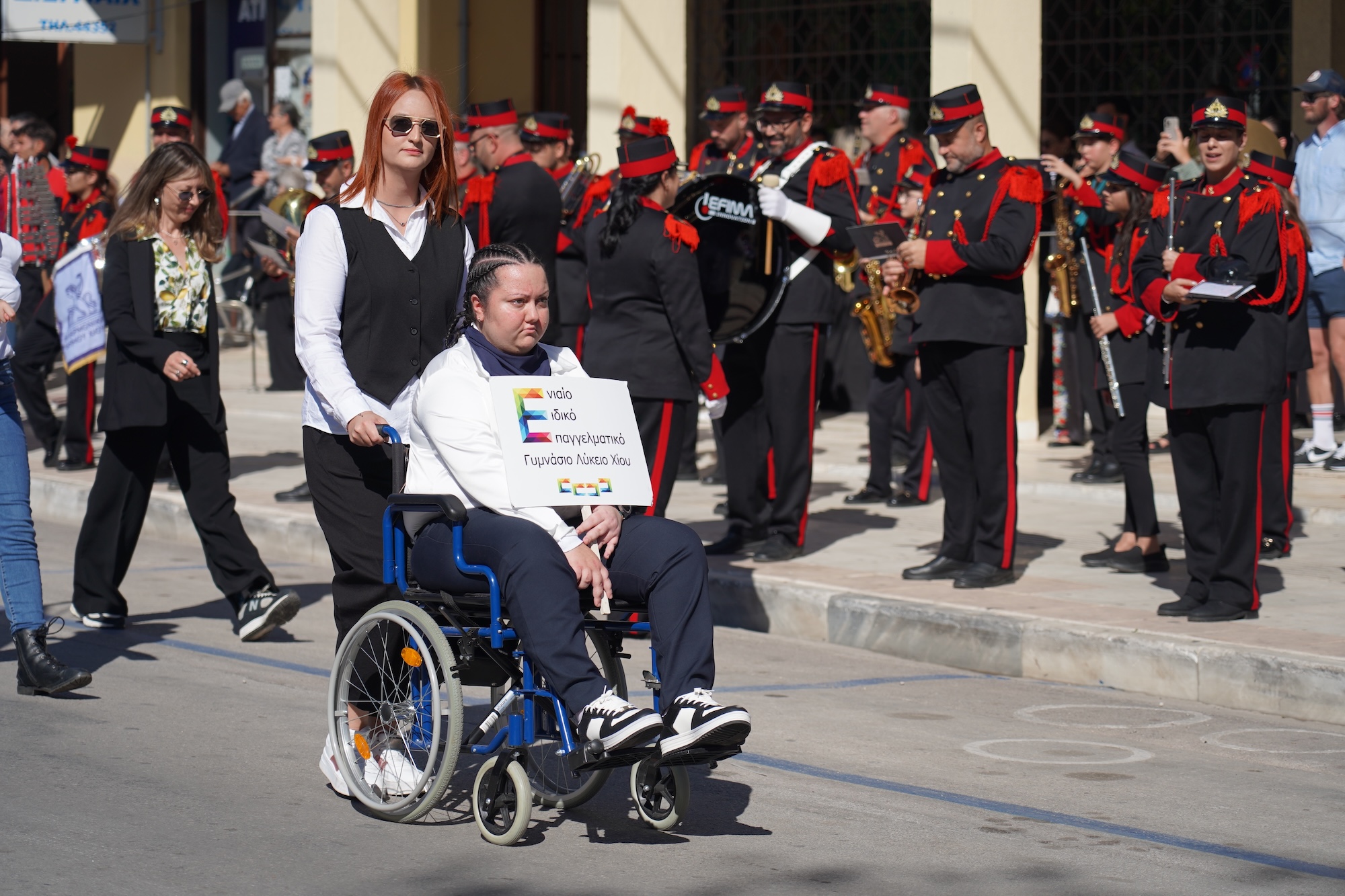 Ακολούθησε στις 10:30 η τέλεση Αρχιερατικού Τρισαγίου και κατάθεση στεφάνων στο Ηρώο των Πεσόντων. Στις 11:05 ξεκίνησε η παρέλαση με τη συμμετοχή της Φιλαρμονικής του Δήμου Χίου, Παλαιών Πολεμιστών, τοπικών Πολιτιστικών και Αθλητικών Συλλόγων, μαθητών και μαθητριών της Πρωτοβάθμιας και Δευτεροβάθμιας Εκπαίδευσης, σπουδαστών των Ακαδημιών Εμπορικού Ναυτικού και των Ελληνικών Εκπαιδευτηρίων Χίου του Τσάκου (T.E.E.N.S), Οδηγών, Προσκόπων, καθώς και τμημάτων του Στρατού και της Στρατιωτικής Μπάντας της 96 Α.Δ.Τ.Ε.