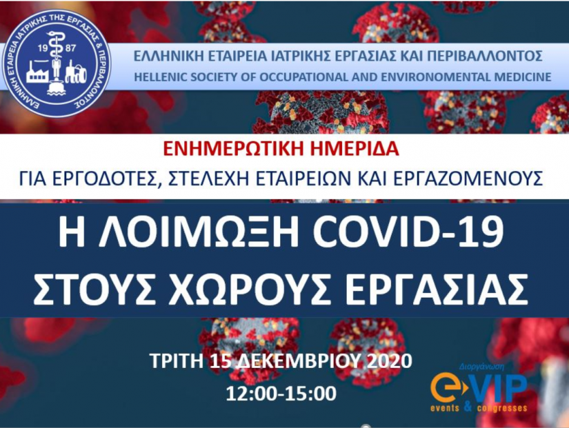 Σας ενημερώνουμε ότι η Ελληνική Εταιρεία Ιατρικής Εργασίας και Περιβάλλοντος (ΕΕΙΕΠ) διοργανώνει ενημερωτική ημερίδα με θέμα: "Η λοίμωξη Covid-19 στους χώρους εργασίας", η οποία θα διεξαχθεί διαδικτυακά την Τρίτη 15 Δεκεμβρίου 2020 και ώρα από 12:00 έως 15:00.