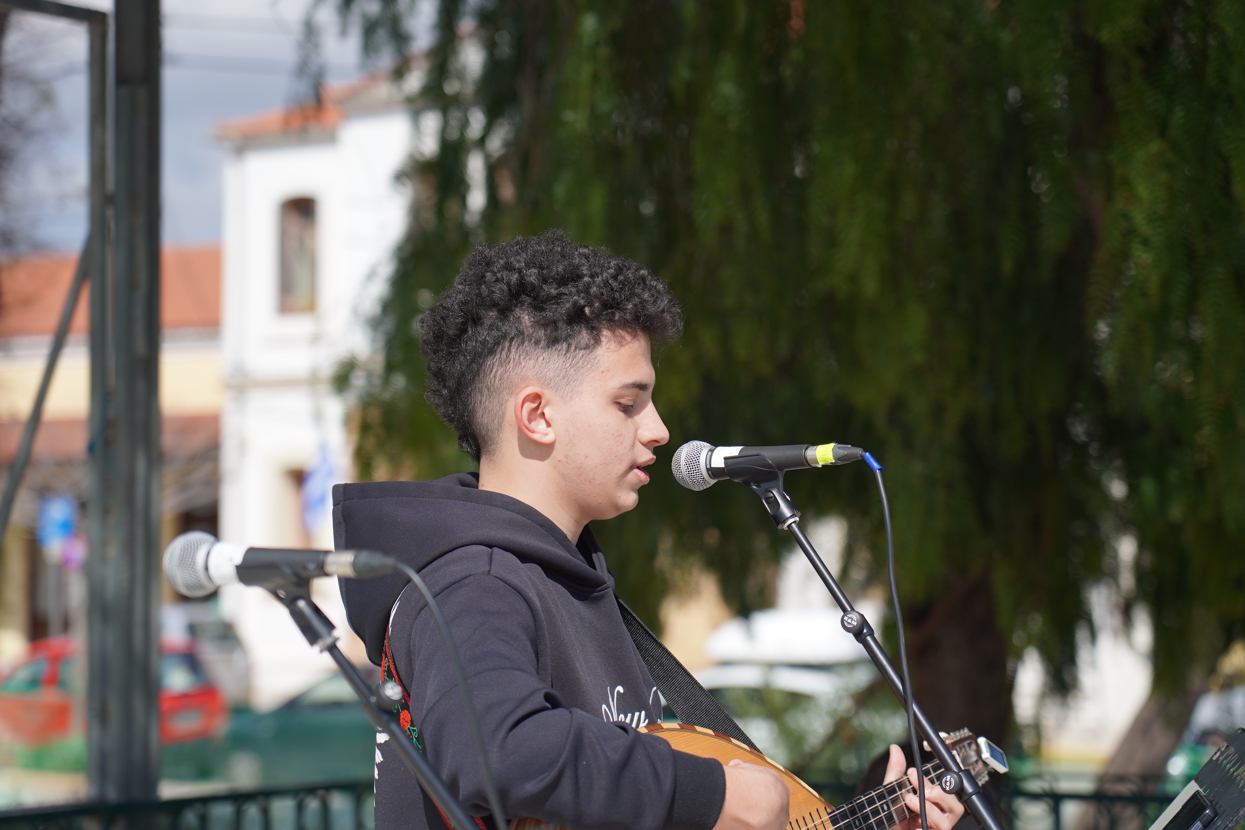 Στη συνέχεια, δύο μαθητές του Μουσικού Σχολείου Χίου ανέβηκαν στο βήμα και ερμήνευσαν δύο αγωνιστικά τραγούδια, δίνοντας έναν τόνο συλλογικότητας και διεκδίκησης.