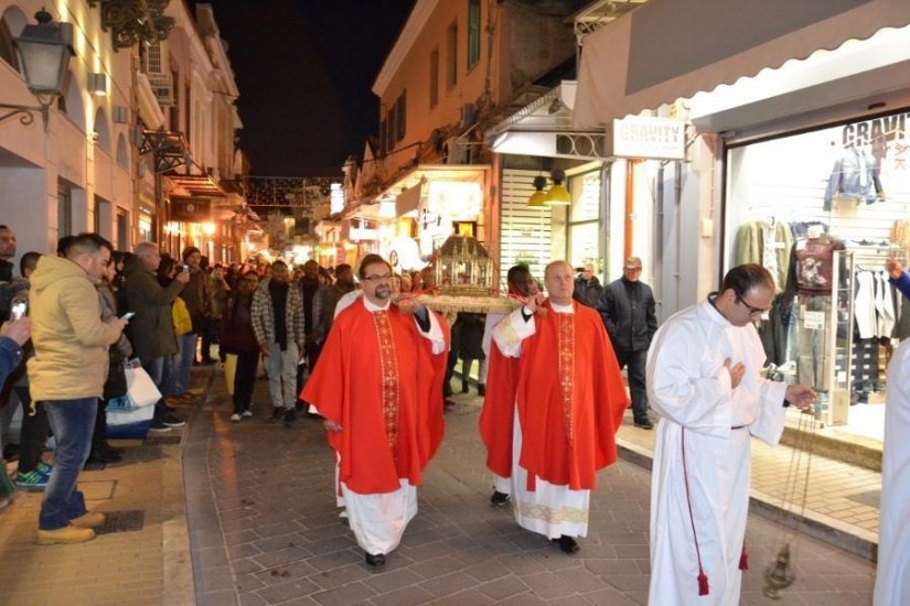 Η καθολική εκκλησία τέλος προγραμματίζει θρησκευτικές τελετές στη μνήμη του Αγίου. Αυτές περιλαμβάνουν θεια λειτουργία στο ναό της Κοιμήσεως της Θεοτόκου στην οδό Ερμού ενώ θα κορυφωθούν το απόγευμα της 14ης Φεβρουαρίου με λιτανεία των λειψάνων αμέσως μετά την ολοκλήρωση του εσπερινού.