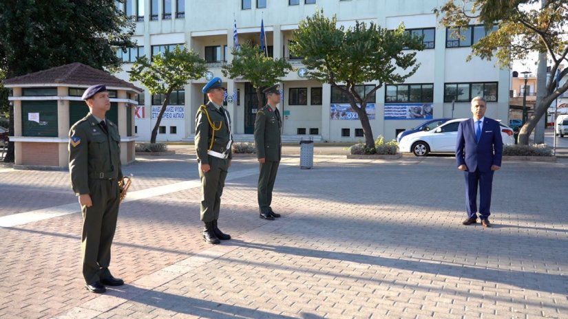 Ο κορωνοϊός έβαλε και εδώ την σφραγίδα του και έτσι στις 8.00 π.μ. την ώρα που ακούγονταν και ο συριγμός έπαρσης σημαίας, της Πυραυλακάτου που ναυλοχεί στο λιμάνι μας, άγημα του Στρατού αποτελούμενο από έναν Αξιωματικό, δύο Στρατονόμους και έναν σαλπιγκτή, πραγματοποίησε έπαρση της σημαίας στην πλατεία Νικολάου Πλαστήρα.