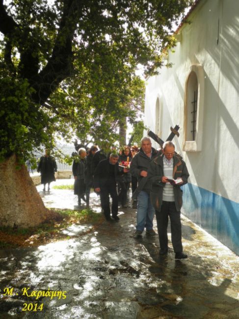 Αγριοπούλουδα της Άγιας Γης, για στόλισμα, στον ταπεινό μα Ιερό Επιτάφιο. Υπερτερούσε περίσσιος σεβασμός και μεράκι. Το αγιολίβανο, αναμίχτηκε με την ανοιξιάτικη μοσκοβολιά και τη μυρουδιά της βρεγμένης γης. Η καμπάνα, εις μάτην προσπαθούσε να τονίσει, εκείνες τις στιγμές, το πένθιμο της ημέρας. Οι θερμοί χαιρετισμοί και τα επιφωνήματα αγάπης για την αντάμωση φίλων, γνωστών και συγγενών υπερτερούσαν των πάντων.