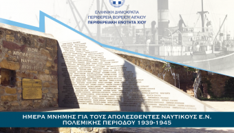 Η Περιφερειακή Ενότητα Χίου διοργανώνει τις εκδηλώσεις για την Ημέρα Μνήμης των Απολεσθέντων Ναυτικών Ε.Ν. Πολεμικής Περιόδου 1939 - 1945 το Σάββατο, 26 Αυγούστου 2023, στις 7:30 μ.μ., στον αύλειο χώρο του Ναυτικού Μουσείου Χίου, ώστε η θυσία των απολεσθέντων αδικοχαμένων ναυτικών να μην ξεχαστεί, αλλά να τιμάται όπως της αξίζει στην ναυτομάνα Χίο και σε ολόκληρη την πατρίδας.
