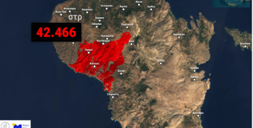 Σύμφωνα με την ανάλυση των δορυφορικών δεδομένων του ευρωπαϊκού μηχανισμού Copernicus EMS, έως τις 12:40 το μεσημέρι της Τετάρτης 13/08, είχαν καεί περίπου στο νησί μας 42.466 στρέμματα , όταν στις υπόλοιπες περιοχές που καίγονταν στη χώρα είχαμε: