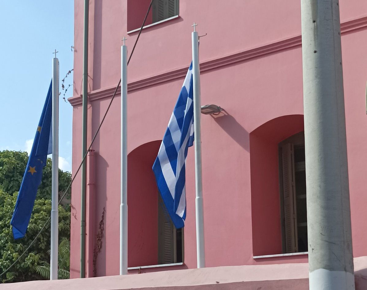 Όχι τίποτα, επειδή το εθνικό μας σύμβολο βρίσκεται αναρτημένο σε αυτήν την κατάσταση κουρελαρίας στα γραφεία της Περιφερειακής Ενότητας Χίου επί της οδού Κ. Μονομάχου, μήπως, μήπως λέμε πρέπει αμέσως να αντικατασταθεί;