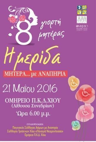 Ο Παγχιακός Σύλλογος Ατόμων με Αναπηρία και ο Σύλλογος Τριτέκνων Ν. Χίου «Παναγιά Νεαμονήτισσα» διοργανώνουν κοινή εκδήλωση – αφιέρωμα στην «Ημέρα της Μητέρας», με θέμα: