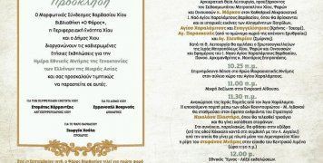 Ο Μορφωτικός Σύνδεσμος Βαρβασίου Χίου Βιβλιοθήκη «Ο φάρος», η Περιφερειακή Ενότητα και ο Δήμος Χίου διοργανώνουν την Κυριακή 17 Σεπτεμβρίου τις καθιερωμένες ετήσιες εκδηλώσεις την Ημέρα Εθνικής Μνήμης των Ελλήνων της Μικράς Ασίας. Οι εκδηλώσεις θα ξεκινήσουν με Αρχιερατική Θεια Λειτουργία στον Καθεδρικό Μικρασιατικό Ναό του Αγίου Χαραλάμπους στο Βαρβάσι, στις 10.25 π.μ. θα τελεστεί επιμνημόσυνη δέηση στο Ηρώο Μικρασιατικής Μνήμης στον αύλειο χώρο του ναού και στις 11.30 π.μ. θα αναχωρήσει Ιερά Πομπή με προορισμό το λιμάνι και ενδιάμεσο σταθμό το άγαλμα του στρατηγού Νικολάου Πλαστήρα, στην περιοχή του ΝΟΧ, όπου θα γίνει κατάθεση στεφάνων.Αναλυτικά το πρόγραμμα στην gallery φωτογραφιών
