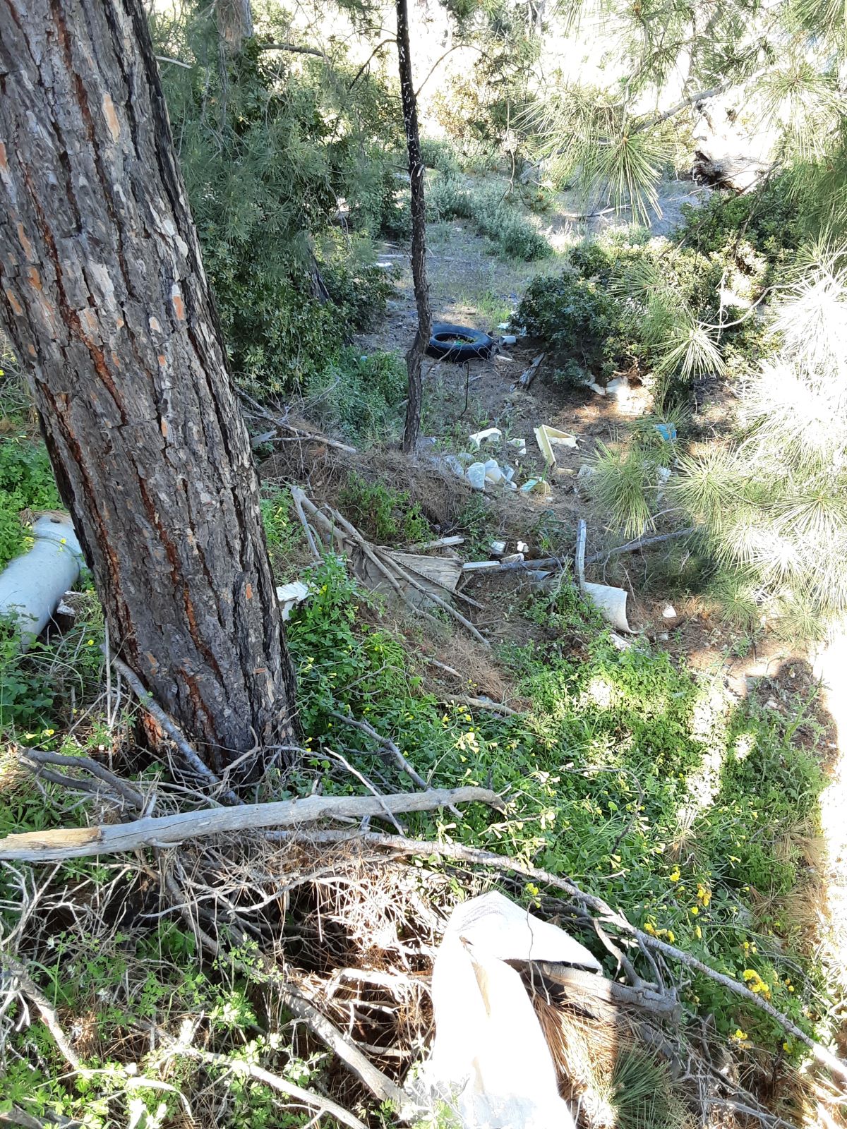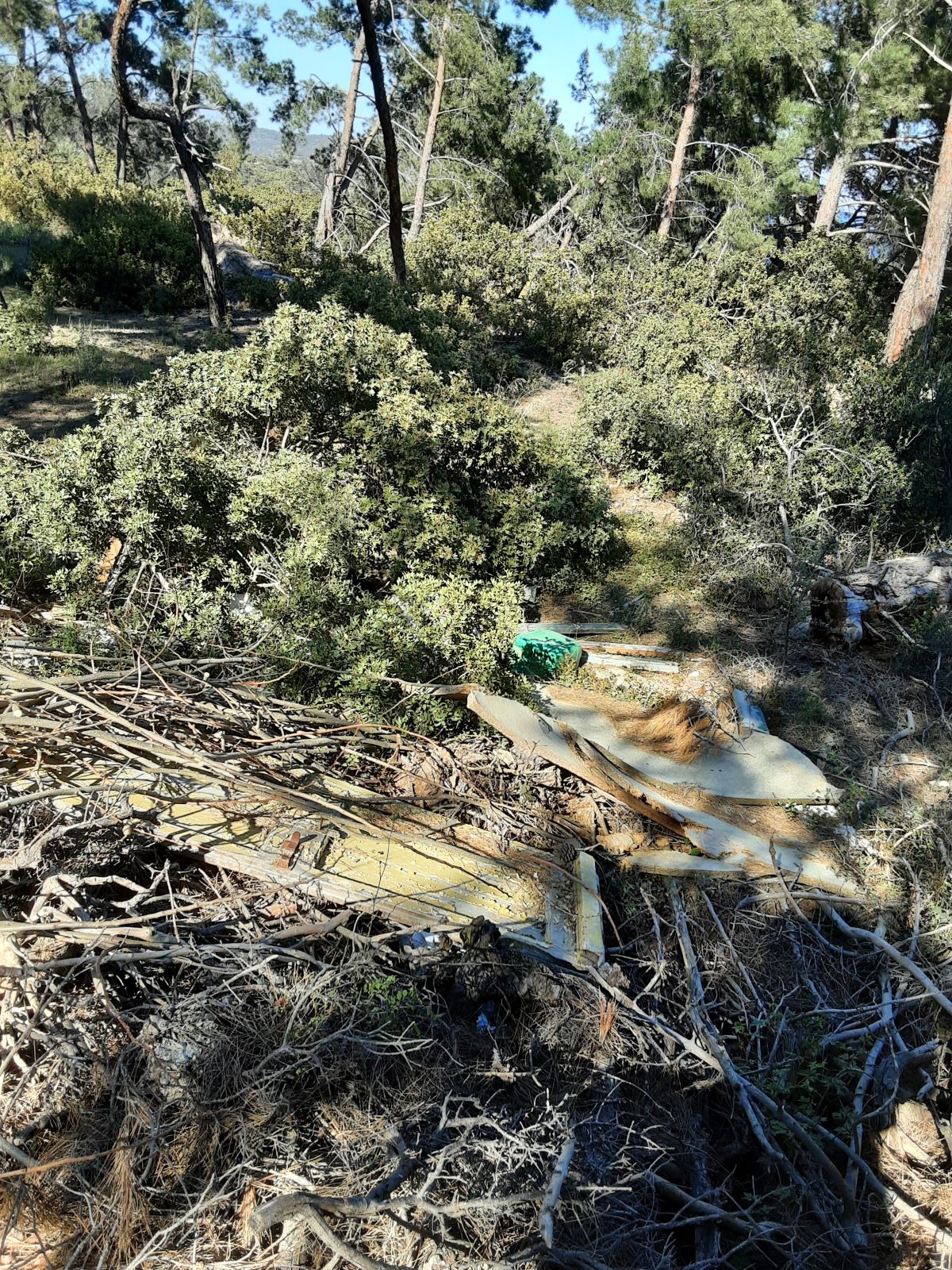Τυχαία πηγαίνοντας με το σύζυγο μου να δούμε κάποια χωράφια μας, παρατηρήσαμε κάτι περίεργο και ανησυχητικό. Εύφλεκτα υλικά, σκουπίδια, πλαστικά, μέταλλα, γυαλιά που κάποιοι τα έχουν μεθοδικά τοποθετήσει/καμουφλάρει σε συστάδες πεύκων ανάμεσα σε αγροτικές περιοχές με ελιές και μαστιχόδεντρα στις περιοχές Χαλός (φωτ.1) και Βασιλική(φωτ.2) των Νενήτων. Καθώς αυτό μας κίνησε την περιέργεια, κάνοντας βόλτες στις γύρω περιοχές, διαπιστώσαμε πολλές περιοχές σε παρόμοια κατάσταση υψηλού κινδύνου. Σε δασικές εκτάσεις κοντά στον Καταρράκτη (φωτ.3 α,β) την Καλλιμασιά (φωτ.4 α,β,γ), συσσωρευμένα μπάζα κι εύφλεκτα υλικά κάτω από πεύκα, μαζί με σπασμένα ή κομμένα ξερά κλαδιά, κουκουνάρια και τις πευκοβελόνες. Στους Βαβύλους υπάρχει ρεματιά γεμάτη τόνους μπάζα μέσα στα πεύκα.