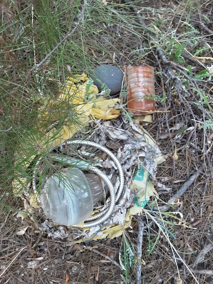 Βρήκαμε επίσης αντικείμενα που κάτω από συγκεκριμένες συνθήκες δύνανται να προκαλέσουν αυτανάφλεξη, όπως ένα γυαλι από φωτιστικό μαζί με σπιραλ από τηλέφωνο ντους και μπουκάλια από αλκοολούχα ποτα με νερό μέσα (φωτ. 5 α,β) σε σημεία που αν πάρει φωτιά εύκολα μπορεί να εξαπλωθεί.