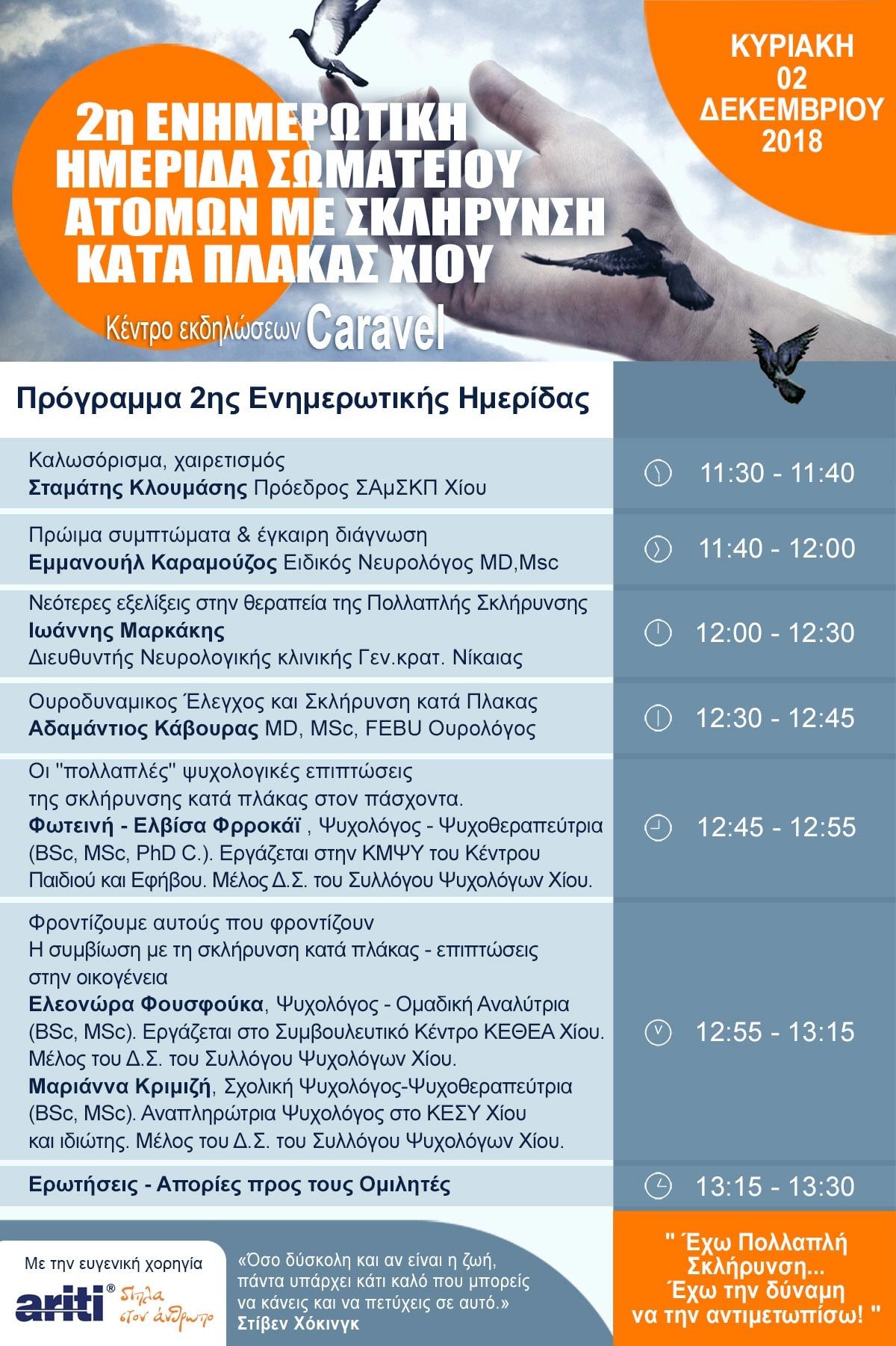 Την Κυριακή 2 Δεκεμβρίου 2018, στις 11:15 π.μ. στο Κέντρο Εκδηλώσεων ''Caravel'' θα πραγματοποιηθεί η 2η Ενημερωτική Ημερίδα του Σωματείου Ατόμων με Σκλήρυνση κατά Πλάκας Χίου.