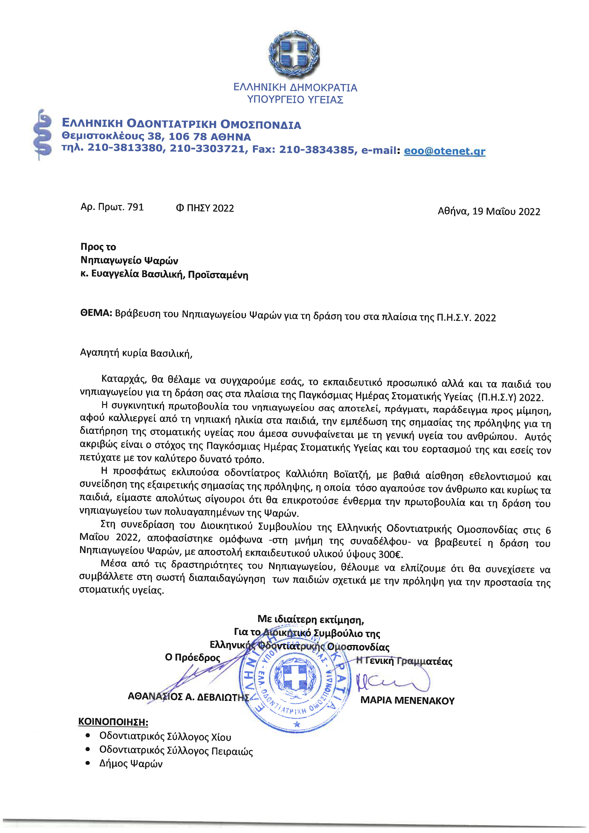 Για τη δράση τους αυτή οι έξι μαθητές τους Νηπιαγωγείου Ψαρών διακρίθηκαν από την Ελληνική Οδοντιατρική Ομοσπονδία και με απόφαση που έλαβε το Διοικητικό Συμβούλιο της στις 6 Μαΐου 2022, αποφασίστηκε ομόφωνα στη μνήμη της εκλιπούσας οδοντιάτρου Καλλιόπης Βογιατζή να βραβευτεί η δράση με αποστολή εκπαιδευτικού υλικού ύψους 300 ευρώ. Η Ελληνική Οδοντιατρική Ομοσπονδία συγχαίρει για τη συγκινητική πρωτοβουλία το εκπαιδευτικό προσωπικό του Νηπιαγωγείου Ψαρών και ελπίζει ότι θα συνεχίσει να συμβάλλει στη σωστή διαπαιδαγώγηση των παιδιών σχετικά με την πρόληψη για την προστασία της στοματικής υγείας μέσα από τις δράσεις του Νηπιαγωγείου.
