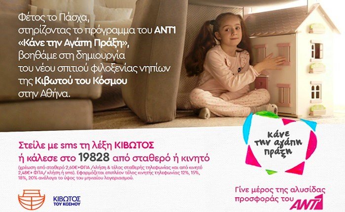 Το φετινό Πάσχα, στηρίζοντας την πρωτοβουλία Κοινωνικής Υπευθυνότητας του ΑΝΤ1, «Κάνε την Αγάπη, Πράξη», μπορούμε όλοι να συμβάλλουμε με έμπρακτο τρόπο στη δημιουργία ενός νέου σπιτιού φιλοξενίας νηπίων της «Κιβωτού του Κόσμου». Ας χαρίσουμε στα παιδιά που έχουν ανάγκη από προστασία ένα ασφαλές μέρος για να ονειρευτούν ένα καλύτερο μέλλον και να ζήσουν ένα καλύτερο παρόν. Από όποιο σημείο της Ελλάδας κι αν βρισκόμαστε μπορούμε να ανοίξουμε την καρδιά μας και να μοιράσουμε χαρά προσπαθώντας να καταφέρουμε να κάνουμε την αγάπη, πράξη.