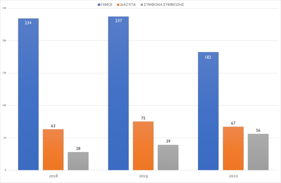 Αντίθετα αυξήθηκαν τα Σύμφωνα Συμβίωσης κατά 43,58% φτάνοντας την προηγούμενη χρονιά στα 56 από τον αριθμό των 39 που έγιναν το 2019 (το 2018 είχαν συναφθεί 28).