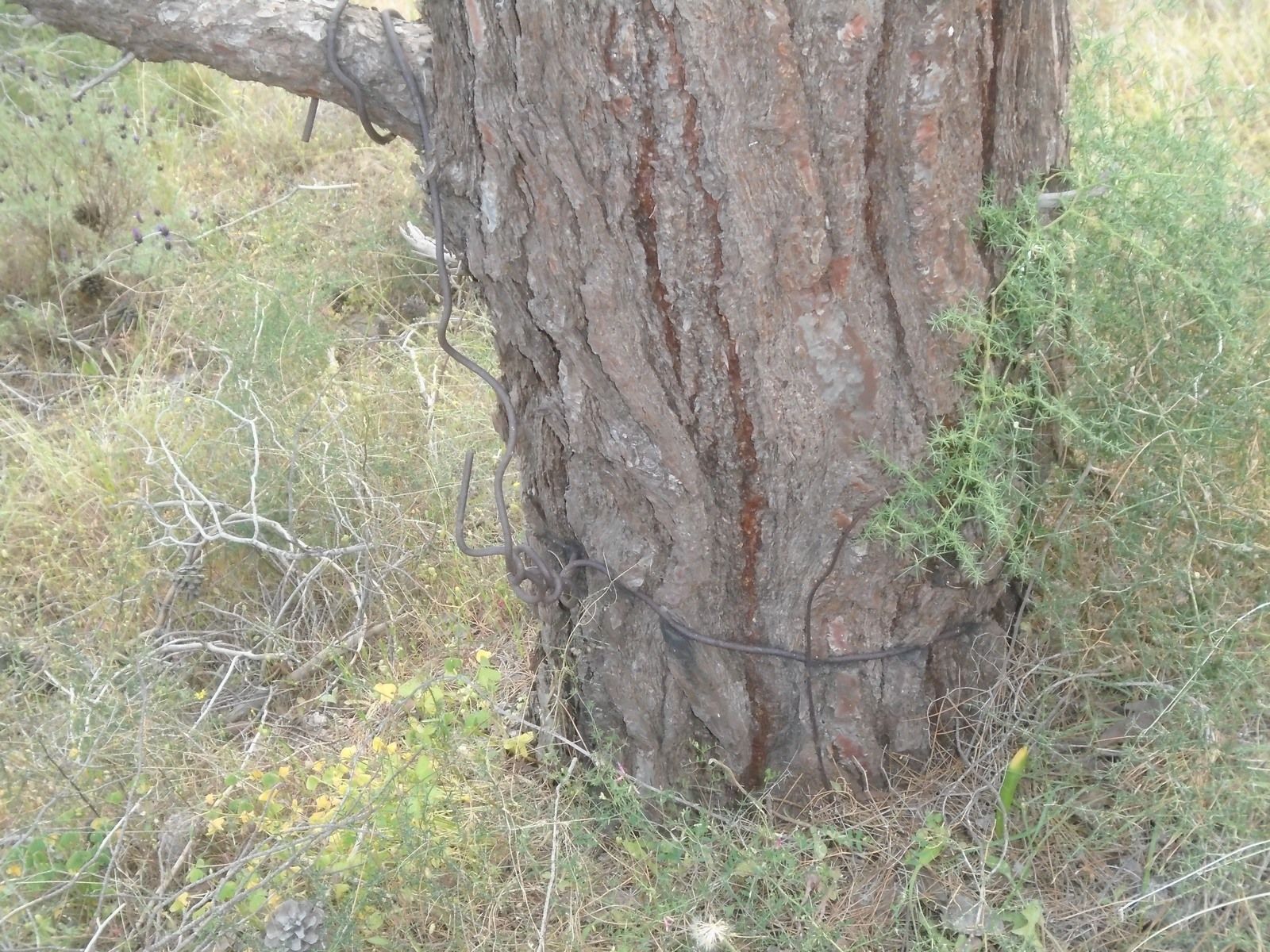 Στις πρώτες τρείς φωτογραφίες βλέπομε τον στραγγαλισμό με χοντρό σύρμα ενός πεύκου. Με αυτόν τον τρόπο οι μπαχαλάκηδες οπως μεγαλώνει το δέντρο επειδή το σύρμα καταστρέφει τον φλοιό που μεγαλώνει ξεραίνεται. Ο χρόνος που χρειάζεται για να ξεραθεί ενα δέντρο ειναι 2-3 χρόνια από την ημέρα που θα μπει το σύρμα.