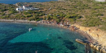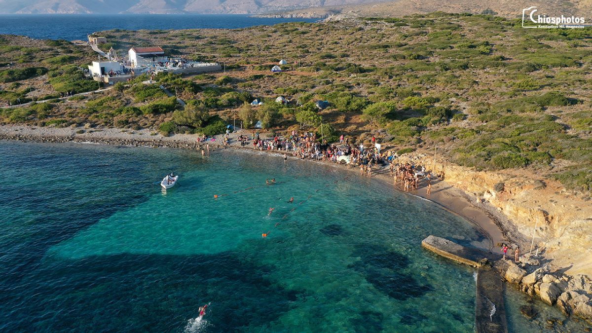 Εκατοντάδες προσκυνητές, μεταφέρθηκαν με σκάφη στο νησάκι απέναντι από την Αγία Ειρήνη, όπου τελέστηκε εσπερινός και ακολούθησε παγχιακό πανηγύρι, ένα από τα μεγαλύτερα, ωραιότερα και σίγουρα το πλέον γραφικό του καλοκαιριού.