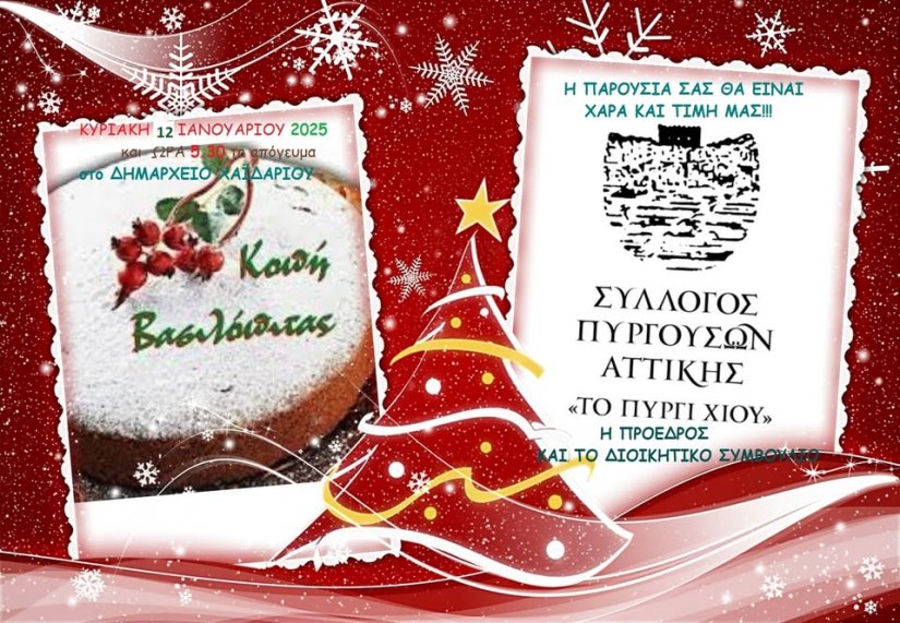 Η Πρόεδρος και το Διοικητικό Συμβούλιο του Συλλόγου Πυργούσων Αττικής "Το Πυργί Χίου" καλούν στην εκδήλωση της κοπής της βασιλόπιτας, που θα γίνει την Κυριακή 12 Ιανουαρίου 2025, στις  5.30 μ.μ., στην αίθουσα εκδηλώσεων του Δημαρχείου Χαϊδαρίου (Στρ. Καραϊσκάκη 138 & Επαύλεως.