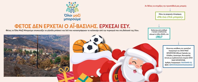 Το καλοκαίρι που πέρασε, οι πυρκαγιές στη Χίο έπληξαν σοβαρά το βόρειο τμήμα του νησιού και απείλησαν άμεσα το σχολείο στο μεγαλύτερο χωριό της περιοχής, τη Βολισσό. Ο περιβάλλων χώρος του σχολείου καταστράφηκε σχεδόν ολοσχερώς, με αποτέλεσμα τα γήπεδα μπάσκετ και 5x5 να χρειάζονται άμεση αποκατάσταση. Γι’ αυτό, η φετινή χριστουγεννιάτικη δράση του Όλοι Μαζί Μπορούμε καλεί όλους μας να γίνουμε Αϊ Βασίληδες για τα παιδιά της Βολισσού, ώστε οι μικροί αθλητές του χωριού να έχουν ξανά τον χώρο όπου έπαιζαν, εκπαιδεύονταν και ονειρεύονταν.