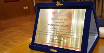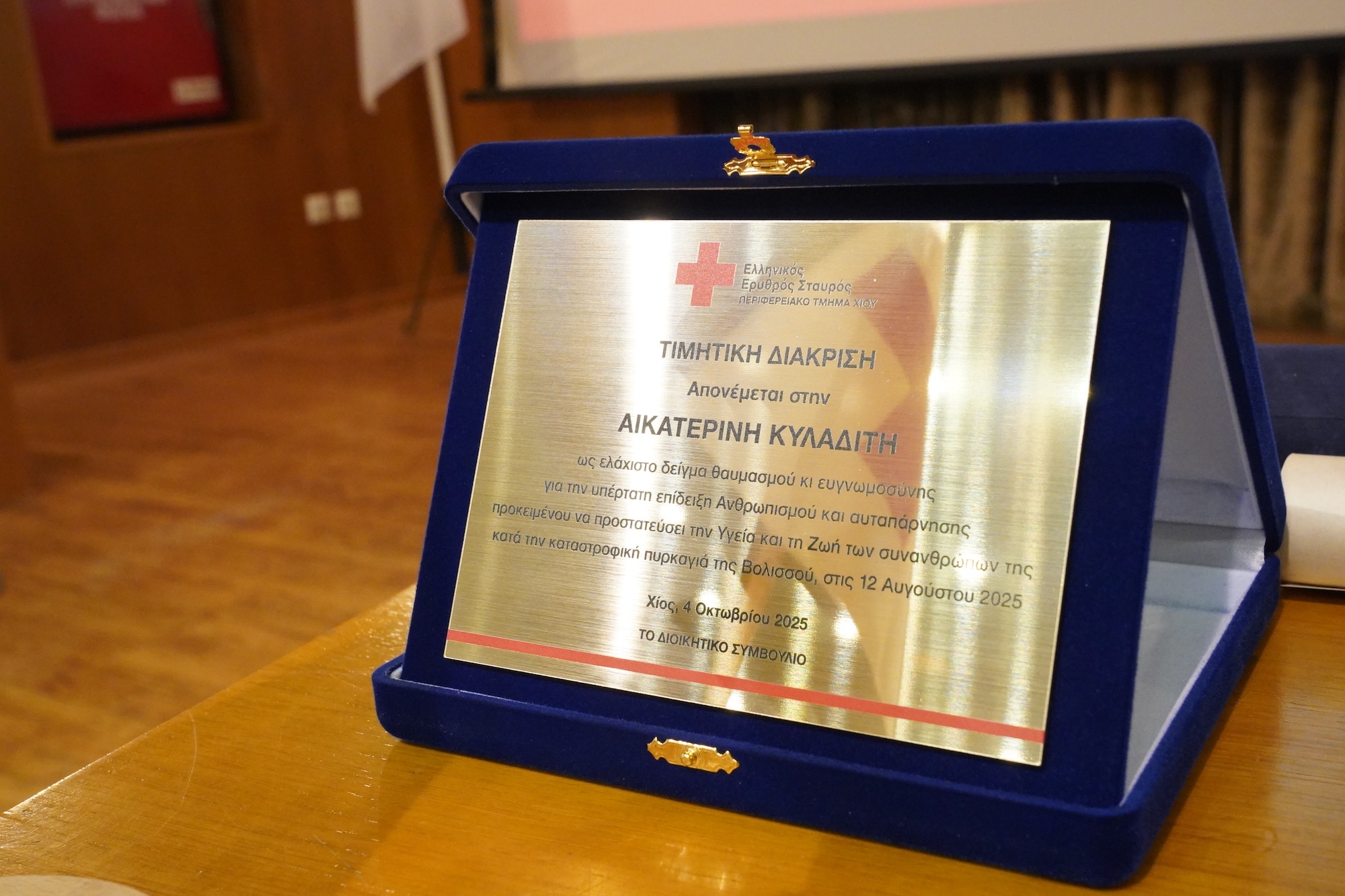 Τιμητική πλακέτα απονεμήθηκε στην εθελόντρια Αικατερίνη Κυλαδίτη, για την αυταπάρνησή της κατά τις πρόσφατες πυρκαγιές στη Χίο, όταν με αυτοθυσία βοήθησε ηλικιωμένους και ευάλωτες ομάδες, ενώ το ίδιο της το σπίτι καιγόταν.