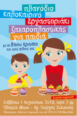Το δεύτερο πλανόδιο παιδικό εργαστηριάκι ζαχαροπλαστικής με τη Βάσω Κριτάκη και τους φίλους της, θα σταθμεύσει την Πέμπτη, 30 Ιουλίου στον πεζόδρομο της οδού Δημογεροντίας (πάροδος Απλωταριάς) έξω από το καφέ ουζερί «Καφαλτί».
