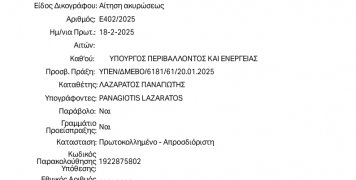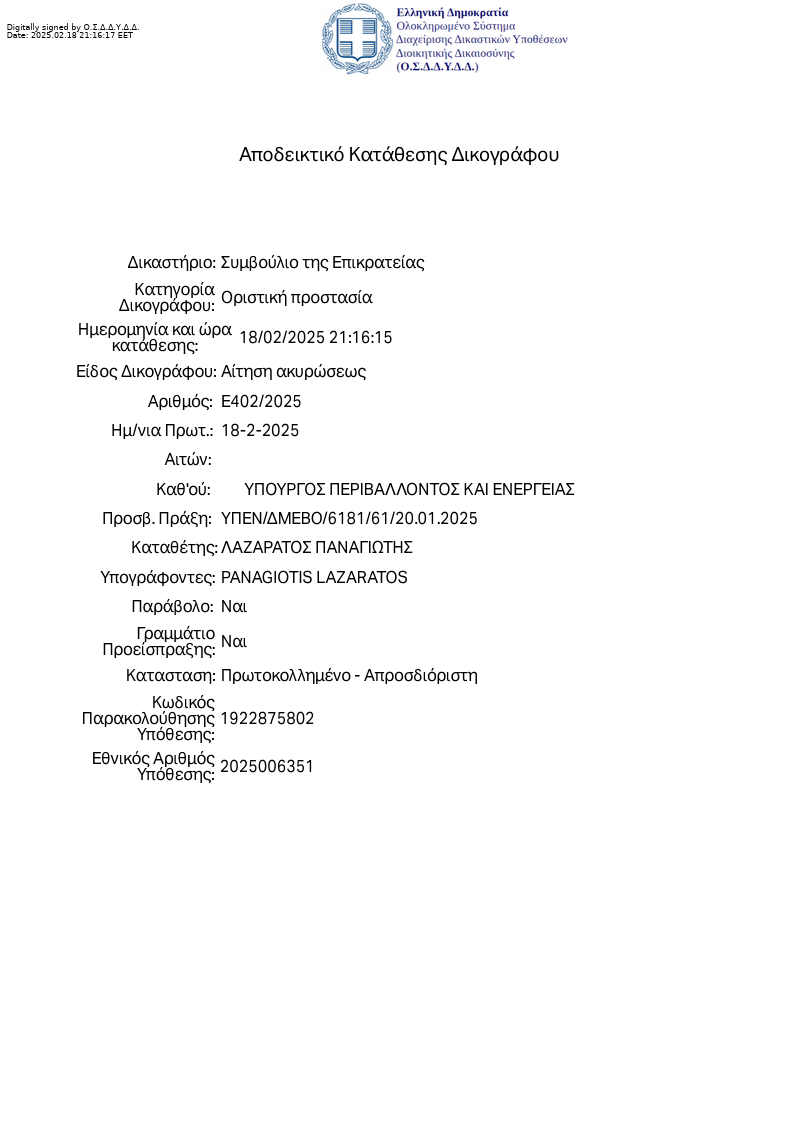 Ήδη από τις 18 Φεβρουαρίου 2025, υποβάλλαμε Αίτηση Ακύρωσης του διαγωνισμού στο Συμβούλιο της Επικρατείας, με αριθμό Ε402/2025 κατά της ΥΠΕΝ/Δ ΜΕΒΟ/6181/61."
