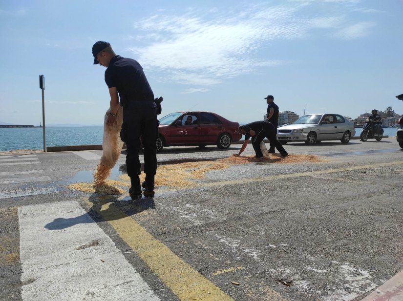 Συγκεκριμένα από διερχόμενο όχημα έπεσαν λάδια στο δρόμο και οι λιμενικοί ρίχνουν ροκανίδια, ενώ παράλληλα στο συγκεκριμένο τμήμα του δρόμου γίνεται ρύθμιση της κυκλοφορίας.