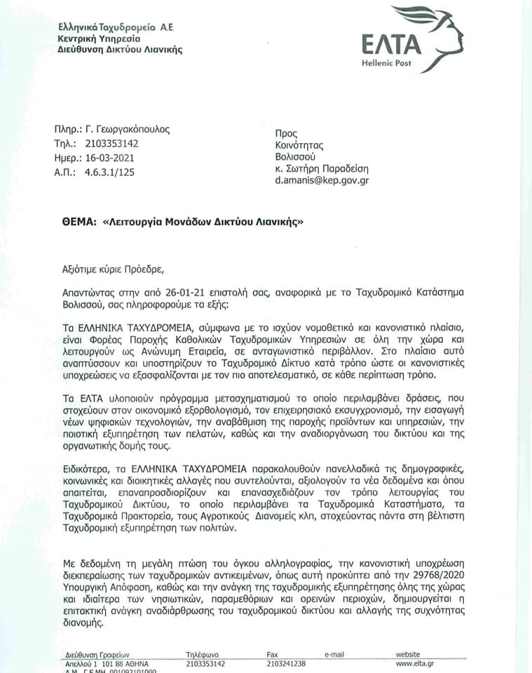 Απαντώντας σε έγγραφο του Συμβουλίου Κοινότητας Βολισσού η Διευθύντρια του Δικτύου Λιανικής των ΕΛΤΑ κ. Κατερίνα Φάρου σημειώνει: «το Ταχυδρομικό Κατάστημα Βολισσού, συνεχίζει να λειτουργεί με έναν (1) τακτικό υπάλληλο και να παρέχει έργο συναλλαγής. Το έργο της διανομής πραγματοποιείται από το Ταχυδρομικό Κατάστημα Καρδαμύλων, χωρίς να επηρεάζεται η ταχυδρομική εξυπηρέτηση των πολιτών»