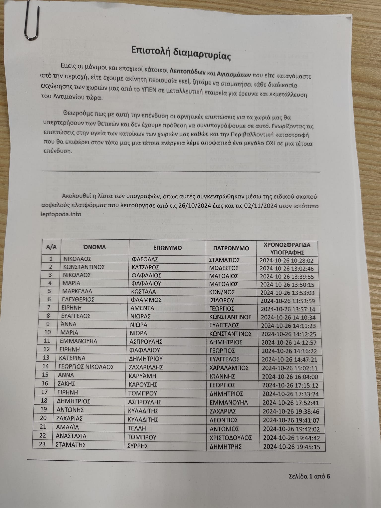 Στην ίδια εκδήλωση κατατέθηκε επιστολή διαμαρτυρίας με 245 υπογραφές πολιτών από τα Αγιάσματα και τα Λεπτόποδα (επισυνάπτεται φωτογραφία)