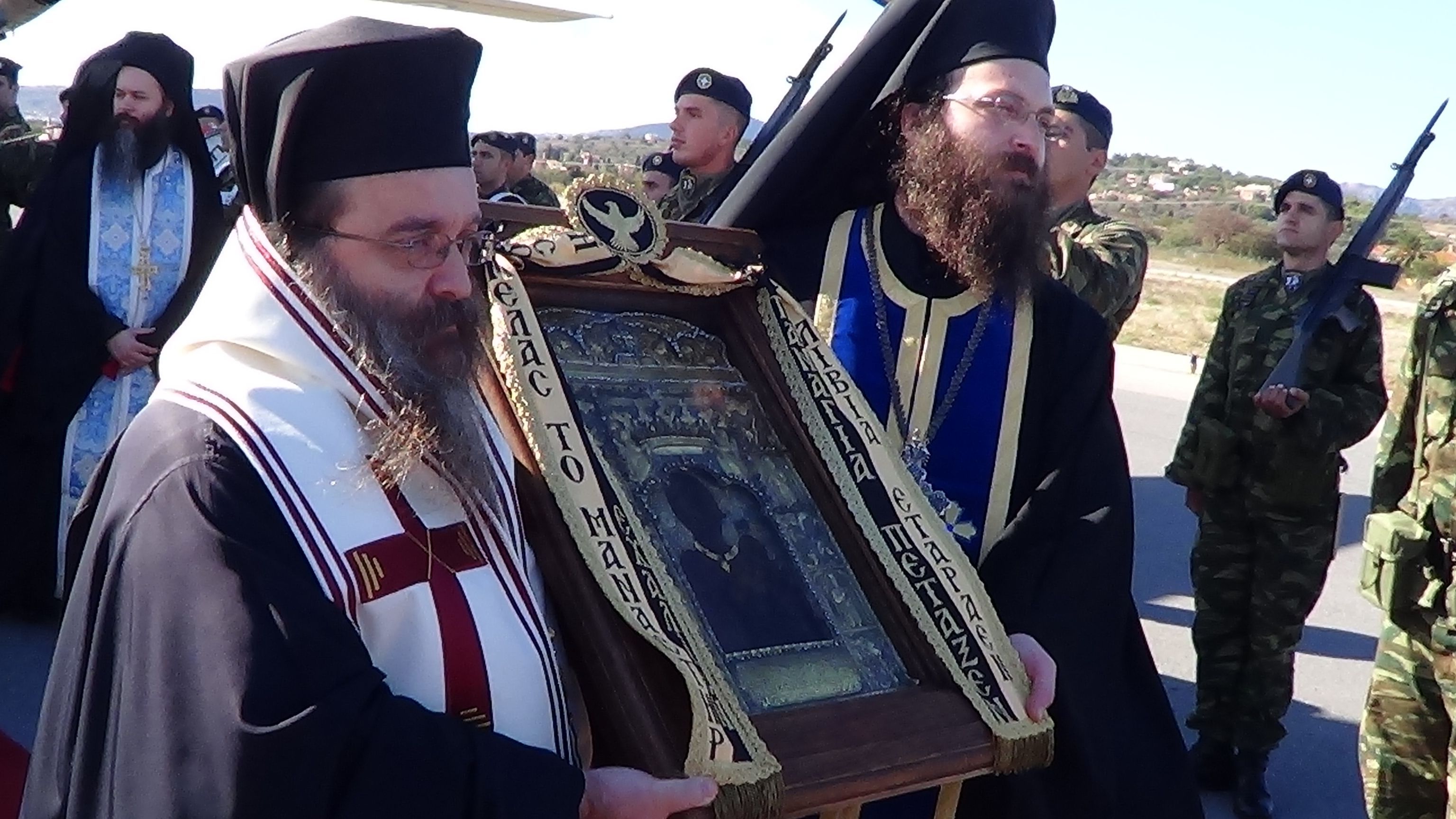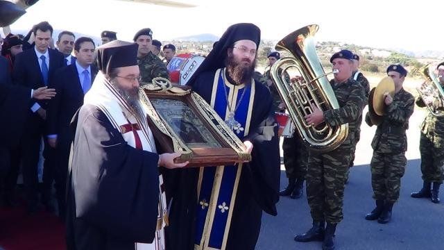 Με τιμές αρχηγού κράτους, έγινε η υποδοχή, δέκα λεπτά πριν τις 11 το πρωί στο αεροδρόμιο «Όμηρος» της Χίου, της εικόνας της Παναγίας Σουμελά.