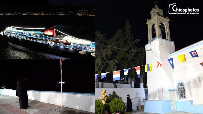 Ο καπετάνιος Γιώργος Αρβανίτης και το πλήρωμα του Νήσος Σάμος, απέδωσαν τιμές στον Άγιο Νικόλαο με συνεχόμενους συριγμούς, ενώ ο εφημέριος του Ναού π. Ιωάννης Κουντουριάδης ευλόγησε το πλήρωμα υπό τον ήχο καμπανοκρουσιών και του απολυτίκιου του Αγίου Νικολάου που έψαλλαν εντός του Ναού.