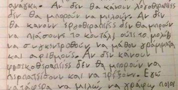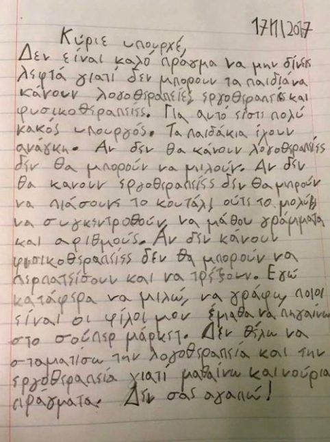 «Τα παιδάκια έχουν ανάγκη. Αν δεν κάνουν λογοθεραπεία δεν θα μπορούν να μιλούν. Αν δεν κάνουν εργοθεραπεία, δεν θα μπορούν να πιάσουν το κουτάλι ούτε το μολύβι να συγκεντρωθούν να μάθουν γράμματα και αριθμούς. Αν δεν κάνουν φυσικοθεραπείες δεν θα μπορούν να περπατήσουν και να τρέξουν», αναφέρει, μέσα σε άλλα, το παιδί στο συγκινητικό σημείωμά του.