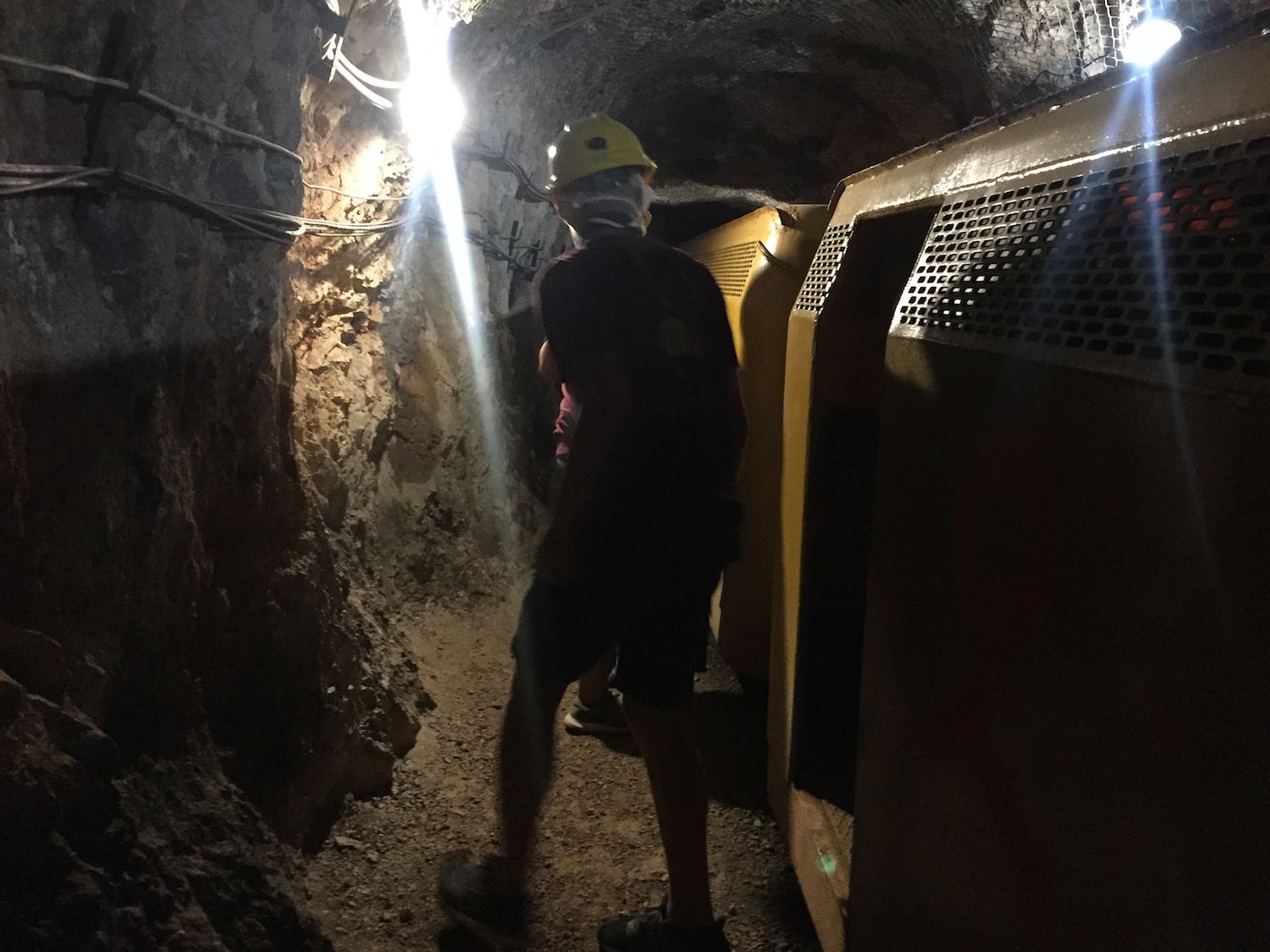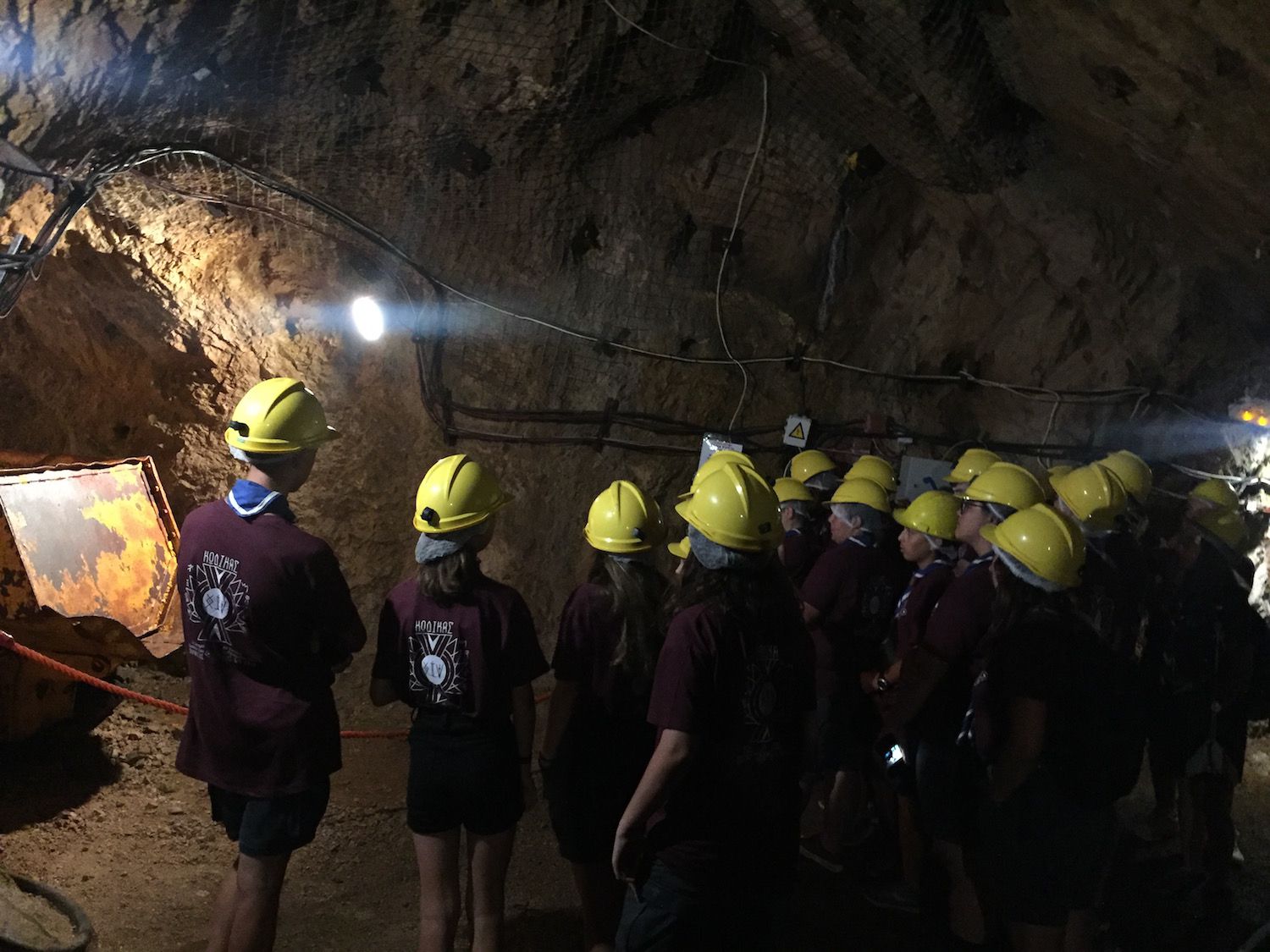Εκεί, οι Πρόσκοποι οδηγήθηκαν με ασανσέρ στη “στοά 850”, η οποία έκλεισε το 1972, η οποία πλέον αποτελεί επισκέψιμο τμήμα του δαιδαλώδους ορυχείου. Φόρεσαν προστατευτικά κίτρινα κράνη και επιβιβάστηκαν στο βαγονέτο, το τρενάκι που χρησιμοποιούσαν οι μεταλλωρύχοι 30 χρόνια πριν. Μετά από σύντομη διαδρομή αποβιβάστηκαν για να περιηγηθούν στη στοά και να γνωρίσουν τον κόσμο των μεταλλωρύχων. Είδαν αναπαραστάσεις εξόρυξης βωξίτη με ομοιώματα εργατών, συνοδευόμενες από εντυπωσιακά οπτικοακουστικά εφέ (ήχοι μηχανημάτων, εκρήξεων, εντολές εργατών). Η υγρασία, η θερμοκρασία και τα οπτικά ερεθίσματα ταξίδεψαν Προσκόπους και Βαθμοφόρους σε μια άλλη εποχή!