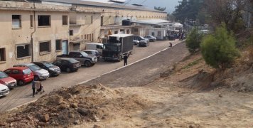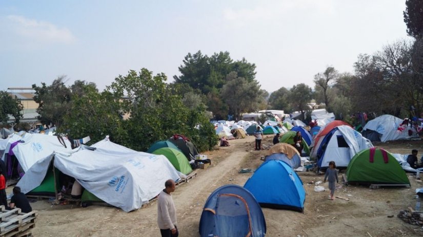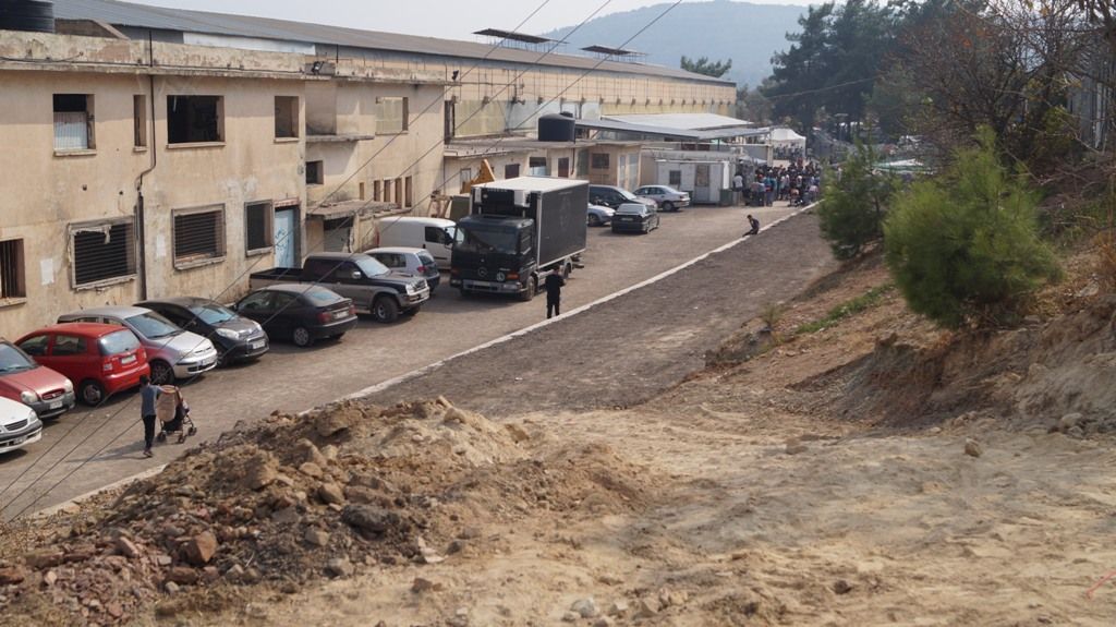 Λίγο πριν από μας είχαν φτάσει περίπου 100 πρόσφυγες-μετανάστες. Στην έξοδο από το ΚΥΤ, αφού έγιναν οι νόμιμες ενέργειες, τους δίνονταν μια μικρή σκηνή και ένα κιβώτιο που από ότι μπορέσαμε να δούμε είχε κουβερτούλα και ένα μικρό υποτυπώδες στρωματάκι…